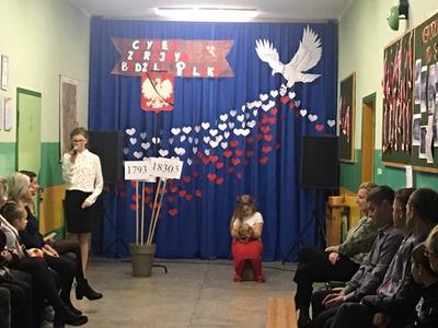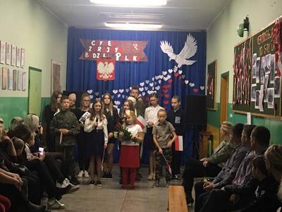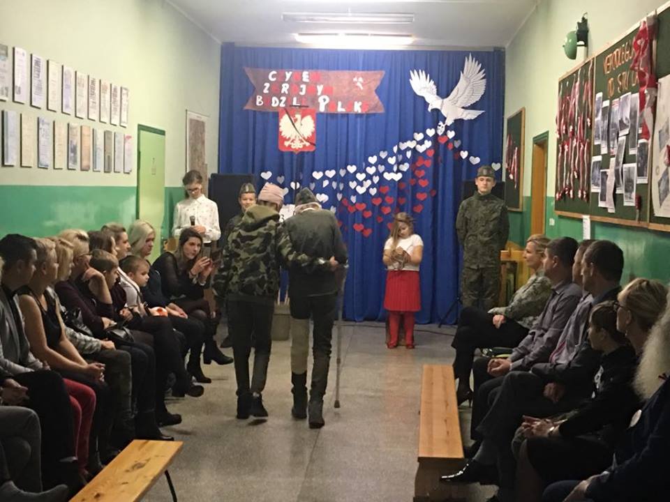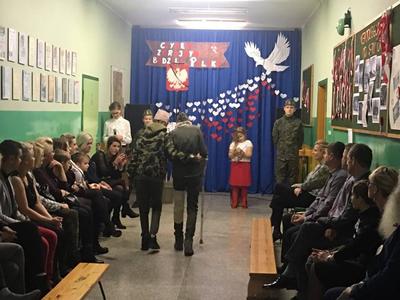Co roku, w listopadzie, czcimy jedno z najważniejszych wydarzeń w naszej historii - Odzyskanie niepodległości. Nasze wspólne śpiewanie to hołd dla tych, którzy walczyli o niepodległość Polski - te słowa rozpoczęły wieczornicę w Zespole Szkolno-Przedszkolnym w Kozarzewie. Po uroczystym powitaniu zgasły światła, przy akompaniamencie muzyki na specjalnie przygotowaną scenę wkroczyli uczniowie, którzy w słowno-muzycznym montażu przypomnieli dzieje drogi Polaków ku wolności. Wszyscy uczestnicy z uwagą i wzruszeniem słuchali treści inscenizacji. Montażowi towarzyszył bogaty repertuar muzyczny. Nad oprawą muzyczną czuwał pan Tomasz Jacek. Po skończonym występie wszyscy uczestnicy zostali poproszeni na poczęstunek. Można było posilić się wojskową grochówką, wypić kawę i zjeść coś słodkiego. Uroczystość przygotowały jak co roku: Pani A. Łuczak, Lidia Ćwiklińska. Aleksandra Nożewska oraz Pan Tomasz Jacek.