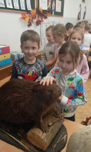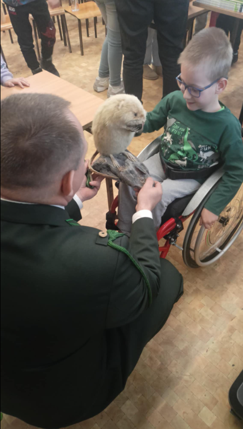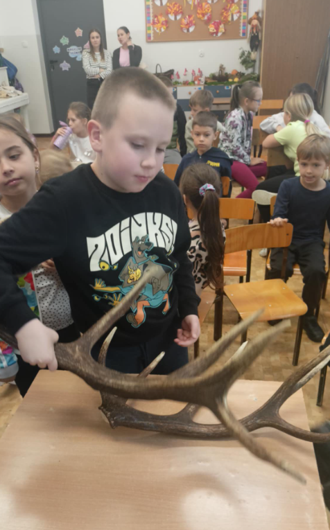 Pan myśliwy przyniósł ze sobą poroża oraz wypchane zwierzęta, dzięki czemu dzieci mogły obejrzeć z bliska różne gatunki.